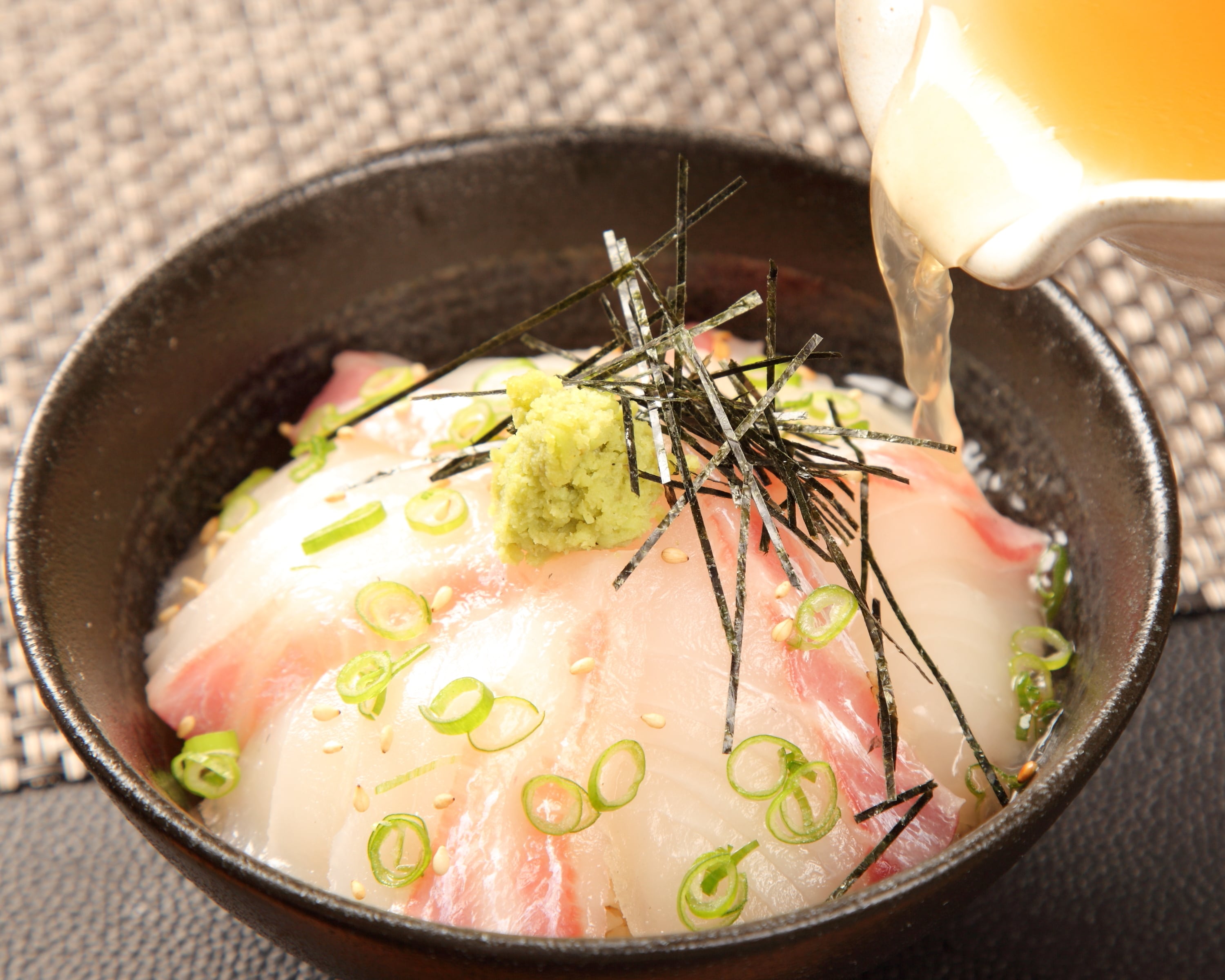 沼津産真鯛を水揚げしたその日のうちに捌き、ごま茶漬けにしました。