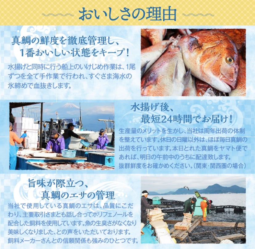 ぷりぷりの食感と美味しさの秘密]メーカーと試行を重ね作り上げた独自配合の餌を使用し、全国にわずか7か所しかない最高品質の海で2年間大切に育てあげました。他産地と比べ、生臭さが無くなり美味しいと評判を頂いております。プロがこだわり抜いた真鯛ぜひご堪能下さい。